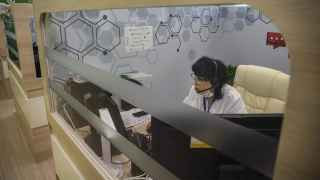 Телемедицинский центр заполнен специальными кабинками, где под изображением британского ученого Майкла Фарадея с пациентами общаются врачи в белых халатах и наушниках. Пока что звонков не очень много.