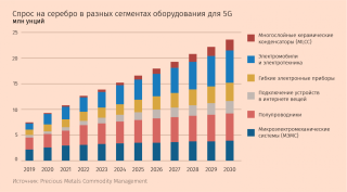 А вот область, которую ждет взрывной рост спроса на серебро, – оборудование и устройства для связи пятого поколения (5G). Аналитики BMO еще в марте указывали, что стремительное развертывание сетей 5G в Китае (тогда было объявлено, что к концу года в 18 провинциях планируется построить более 413 000 базовых станций) положительно отразится на рынке серебра. Серебро будет «необходимым компонентом практически для всех аспектов этой технологии», говорится в докладе Precious Metals Commodity Management для The Silver Institute. По данным ее экспертов, в 2019 г. мировой спрос на серебро, связанный с только начавшей разворачиваться технологией 5G, составил 7,5 млн унций, но к 2025 г. он вырастет до 16 млн, а к 2030 г. – до 23 млн. Серебро будет необходимо и для интернета вещей, который невозможен без 5G. Эти сферы ждет ускоренное развитие после пандемии, уверены аналитики Morgan Stanley: гораздо больше людей будет работать из дома (и им нужны быстрые каналы связи, способные передавать большие объемы информации), а компании активнее займутся трансформацией бизнеса, включая автоматизацию производства и интернет вещей, будут развиваться умные города, автономный и электрический транспорт.