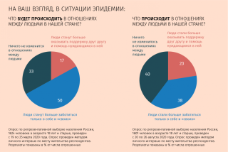 Опрос, проведенный еще только в преддверии неизвестной беды, показал, что версию «все будут всем помогать» чаще всего разделяли люди, рожденные и воспитывавшиеся в советское время, а также люди, приученные уважать власть (частью это они же), но еще и люди, сами облеченные хоть какой-то властью. Однако и среди этих категорий ответ «Люди станут больше оказывать поддержку друг другу и помощь нуждающимся в ней» в марте выбирали от силы 22%. В полтора раза чаще (32%-35%) они склонялись к прогнозу, что «ничего не изменится в отношениях между людьми», т. е. отрицали версию, что в беде-то мы сплотимся и поддержим друг друга. И в названных категориях, и во всех остальных большинство держалось мнения, что люди станут больше заботиться только о себе и «своих».