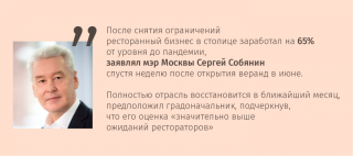 В конце апреля, когда в Москве действовали жесткие ограничения, связанные с пандемией COVID-19, и заведения общепита были закрыты, президент Федерации рестораторов и отельеров (ФРиО) Игорь Бухаров заявил, что без адекватной помощи государства с рынка могут уйти 70% заведений. По данным Департамента потребительского рынка Москвы, после окончания периода изоляции в июне возобновили деятельность 12 306 заведений – это 84,6% от их числа в марте 2020 г. (14 462). На начало сентября 2020 г. в Москве работали 14 552 заведения общественного питания.