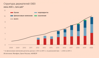 По мнению АКРА, рост доли долгосрочных инвесторов в госдолге является вопросом средне- и долгосрочной перспективы, но не краткосрочной. Чтобы увеличить вложения в ОФЗ, им надо нарастить активы, но это дело не быстрое, а накопительная часть пенсий и вовсе заморожена. С 2015 г. доля денежных средств и депозитов у финансовых компаний сократилась на 4,5 п. п. (до 14,4% активов к июлю 2020 г.).