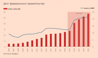 Но и госдолг у России небольшой, а ставки рекордно низкие, поэтому выбор был сделан в пользу займов. Этот год Россия начала с госдолгом 12,3% ВВП (13,6 трлн руб.), а закончить Минфин собирается с 19% ВВП (20,4 трлн), к 2023 г. долг вырастет до 28,4 трлн руб., или 21,4% ВВП, – в разы меньше, чем в большинстве других стран.