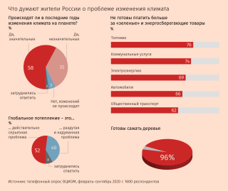 Средняя температура на территории России повышается быстрее, чем в других частях Земли, однако в России антикризисные меры не предполагают стимулирования зеленой экономики, констатирует Greenpeace. Зато жители постепенно переходят от климатического скептицизма к признанию проблемы. Несмотря на то что в школьных учебниках изменение климата представлено очень плохо, научные знания постепенно проникают и сомневающихся стало меньше, чем 10–15 лет назад, рассказал VTimes Кокорин. Абсолютное большинство (93%) россиян признают, что в последние годы на планете происходят изменения климата, показал недавний опрос ВЦИОМа. При этом больше половины (52%) назвали это значимой проблемой, но 40% сказали, что проблема «надумана и раздута». Проблема действительно раздута, в том числе СМИ, которые любят делать из этого страшилки, замечает Кокорин, но она не надумана и было не совсем корректно объединять это в один вопрос. Очень хорошо, что есть готовность что-то делать, например 96% респондентов готовы сажать деревья для сокращения выбросов СO2, отмечает он.