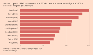 Резкий рост акций крупных технологических корпораций в 2020 г. стал подарком для компаний, решивших провести IPO. В сентябре инвесторы взвинтили цены на акции облачной компании Snowflake, сделав ставку на то, что ей будет выгоден перевод бизнесом своих операций в онлайн. Акции Snowflake выросли более чем вдвое в первый день торгов, и их приобрела даже Berkshire Hathaway Уоррена Баффетта, который обычно предпочитает недорогие покупки. Аналогичные мотивы подняли цену акций DoorDash, извлекшей выгоду из бума на доставку продуктов.