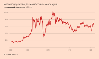 Все больше аналитиков и инвесторов рассматривают недавнее ралли на рынке меди как первый этап бычьего рынка, который позволит цене превысить рекордный уровень более $10 000 за тонну, установленный в начале 2011 г. В пятницу стоимость самого важного промышленного металла достигала в ходе торгов семилетнего максимума $8000 за тонну, поднявшись более чем на 70% с мартовского минимума.
