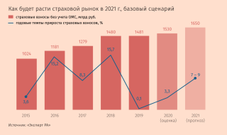 В следующем году страховой рынок будет восстанавливаться от последствий коронавируса умеренными темпами вслед за плавным восстановлением экономики и вырастет на 7–9% до 1,65 трлн руб. Такой прогноз предполагает базовый сценарий рейтингового агентства «Эксперт РА». В консервативном сценарии рынок тоже вырастет, но уже на 4–5% до 1,6 трлн руб. Какой сценарий реализуется, во многом будет зависеть от того, как долго деловая активность будет возвращаться к докризисным уровням, говорится в отчете агентства. Факторами неопределенности останутся развитие ситуации с коронавирусом и длительность рецессии в мировой экономике.