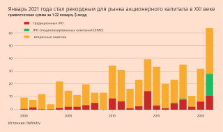 С начала года по 22 января компании привлекли $337 млрд на рынках облигаций и рекордные для этого периода $64 млрд в виде первичных и вторичных размещений акций. По данным Refinitiv, на рынке акций привлечено в два с лишним раза больше средств, чем 1–22 января 2020 г. Частично это объясняется бумом IPO специализированных компаний (special purpose acquisition company — SPAC), которые на привлеченные деньги покупают другие компании, зачастую непубличные, выводя их таким образом на биржу.