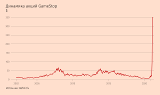 С начала года по среду акции GameStop выросли примерно на 1800%, причем началось ралли в середине месяца. В начале января акции стоили $17–18, а на утренних торгах в четверг взлетали до $468,5. После этого они падали до $126, когда брокерские компании стали ограничивать новые вложения в GameStop, затем поднялись выше $250, потом снова начали снижаться.