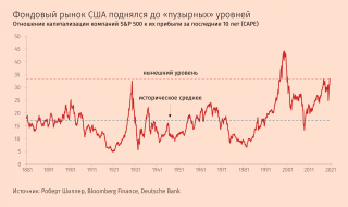 Коэффициенты стоимости для американского рынка акций близки к историческим максимумам, указывает Джим Рид, главный стратег Deutsche Bank. Показатель дороговизны акций в долгосрочной перспективе — отношение капитализации компаний из индекса S&P 500 к их совокупной прибыли за последние 10 лет (CAPE) — превышал нынешний уровень лишь во время технологического пузыря в 1999–2000 гг. Сегодняшнее значение (около 34) даже чуть выше, чем в 1929 г., накануне Великой депрессии.