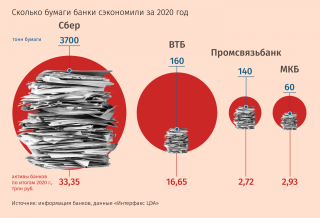 Банки сами гордятся такой экономией. Сбербанк подсчитал, что сэкономил за год 60 вагонов бумаги — 742 млн листов, или 3700 т. То есть могли сохранить более 60 000 деревьев, сообщил первый заместитель председателя правления Сбербанка Александр Ведяхин.