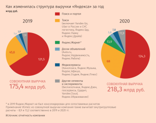 В 2020 году быстрее всего росли медиа-сервисы (вдвое), экспериментальные направления, куда входят, в частности, беспилотники, геосервисы и «Яндекс.Дзен» (+50%), и такси с каршерингом и фудтехом (вместе прибавили 49%). Также компания отметила, что еще заработала почти в 2,5 раза больше на устройствах с голосовым помощником «Алиса», чем в 2019 г. Однако в денежном выражении это пока несущественная доля выручки в масштабах всей компании — 3,7 млрд руб. против 1,5 млрд руб. годом ранее.