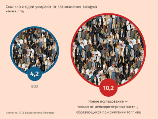В начале февраля группа университетских ученых из Гарварда, Бирмингема, Лестера и Лондона опубликовала в издании Environmental Research сенсационное исследование: избыточная смертность в мире из-за воздуха, загрязненного продуктами сжигания ископаемого топлива, — 10,2 млн человек. Это в 2,4 раза больше, чем оценка избыточной смертности, которую дает Всемирная организация здравоохранения (ВОЗ) от всех видов загрязнения воздуха. Англо-американские исследователи оценивали только влияние на организм человека мелкодисперсных частиц PM2,5, которые образуются в первую очередь из-за сжигания угля, бензина и дизельного топлива. В 2012 г. большая часть из 10,2 млн умерших пришлась на Китай (3,9 млн) и Индию (2,5 млн). Но уже в 2018 г., по оценкам ученых, число таких смертей сократилось до 8,7 млн благодаря политике Китая по сокращению выбросов. «Это четкий сигнал политикам и заинтересованным сторонам для дальнейшего стимулирования перехода к чистым источникам энергии», — констатируют ученые.