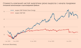 Индекс S&P Global Clean Energy, в который входят акции 30 компаний сектора чистой энергетики, за последний год вырос почти вдвое. Отношение капитализации его компаний к прибыли (P/E), прогнозируемой на ближайшие 12 месяцев, составляет 41, по данным Bloomberg. Между тем американский индекс S&P 500 за тот же период вырос примерно на 16%, и у него P/E — 23.