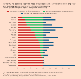 Доля госкомпаний, у которых себестоимость добычи обычно ниже, чем у частных, действительно может вырасти, подтверждает Carbon Tracker, — с 55% мировой добычи нефти и газа в 2020 г. до 64% в 2040 г. Но сама добыча в сценарии устойчивого развития сократится у них за этот период на 28% — с 52 млн до 38 млн баррелей в сутки, говорится в докладе.