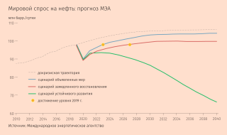 В сценарии устойчивого развития (50%-ная вероятность ограничения роста мировой температуры на 1,65°) спрос на нефть падает ниже 70 млн баррелей в сутки, цена взята на уровне $40 за баррель.