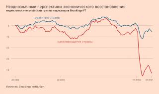 Главным фактором, который определит экономические успехи стран в 2021 г., скорее всего будет их способность контролировать распространение ковида. Об этом свидетельствует индекс восстановления мировой экономики, который для FT составляет Brookings Institution. Согласно индексу, развитые страны в ближайшие месяцы будут сильно обгонять развивающиеся по темпам роста экономики, финансовым индикаторам, уверенности инвесторов.