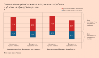 Максимальное количество баллов в тесте на знание срочного рынка — 5, на знание облигаций без рейтинга и других финансовых инструментов (к ним ЦБ отнес низколиквидные ценные бумаги) — 6. ЦБ сравнивал, как соотносятся средняя доходность и оценка инвесторов, а также сопоставил, как менялось соотношение убытков и прибыли в группах с худшими и лучшими ответами. Худшими ответами считались баллы от 0 до 2 для облигаций без рейтинга, от 0 до 4 — для иных финансовых инструментов и от 0 до 3 — для срочного рынка (вопросы по разным группам инструментов заметно различались по сложности, и требовалось заметное — не менее 15–20% группы — количество респондентов с относительно низкими оценками, объясняет ЦБ).