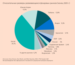 Фондовый рынок Китая тоже исчез после прихода к власти коммунистов в 1949 г. За исключением этого общего фактора судьбы российского и китайского рынков диаметрально противоположны. В 1900 г. на китайские акции приходилось 0,34% от совокупной капитализации мирового рынка — столько сейчас у России (в 2020 г.). Китайский же рынок, возродившийся, как и российский, в начале 1990-х гг., сейчас занимает 3-е место в мире с 5,1% и является крупнейшим среди развивающихся рынков (39,1%).