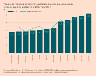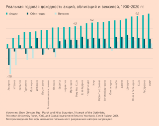 Хотя российский рынок акций бóльшую часть времени из 121 года считался враждебным народу творением капиталистов, в годы своего существования он показал одну из самых высоких реальных доходностей в мире — 8,8%. Он обогнал все отдельные развитые рынки и их индекс (на 2,7 п. п.), а среди основных развивающихся уступил только Южной Корее, Гонконгу и Тайваню.