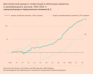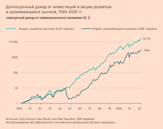 Это во многом объясняется сильной волатильностью (включая ликвидацию рынков после революций, как в России и Китае), переходами рынков из категории в категорию и разной динамикой в разные периоды. Если в начале ХХ в. развивающиеся рынки акций показывали лучшие результаты, то затем сильно отстали на полвека, но зато в 1960–2020 гг. их совокупный доход составил 11,2% против 9,5% у развитых.