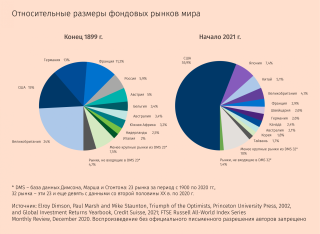 Димсон, Марш и Стонтон собрали данные о годовой доходности акций, облигаций, векселей, данные по инфляции и валютным курсам 32 стран. Из них данные за период с 1900 по 2020 г. есть по 23 странам, еще по девяти – со второй половины ХХ в. Проанализированные данные по доходности акций за разные периоды есть в целом по 90 странам (на их основе рассчитывается доходность индексов мирового, развитых и развивающихся рынков).