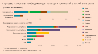 Для энергосистемы, основанной на зеленых технологиях, нужно гораздо больше рудного сырья, чем для традиционной. В результате увеличения доли ВИЭ в мировом энергобалансе среднее количество рудных ископаемых, необходимых для производства новой единицы электроэнергии, уже выросло с 2010 г. на 50%. Для электросетей нужны алюминий и медь в огромных количествах, отмечает МЭА, при этом последняя «является краеугольным камнем для всех технологий, связанных с электричеством», включая ветряные энергоустановки и электромобили. Для ветряной электростанции нужно в девять раз больше рудного сырья, чем для работающей на газе, а для электрического автомобиля — в шесть раз больше, чем для обычного.