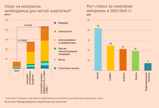 До середины 2010 г. спрос на рудные материалы со стороны энергетического сектора был относительно невелик. Но ситуация уже начала быстро меняться. В сценарии устойчивого развития МЭА (предполагает достижение цели Парижского соглашения по ограничению роста мировой температуры темпами «значительно ниже 2°С») в ближайшие 20 лет доля технологий, связанных с чистой энергетикой, увеличится в спросе на медь и редкоземельные металлы до более чем 40%, на никель и кобальт — до 60–70%, на литий — почти до 90%.