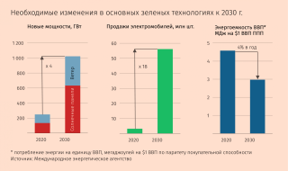 Постоянно дешевеющие технологии в сфере возобновляемой энергетики позволяют электроэнергетическому сектору сыграть основную роль в переходе к экономике с нулевыми нетто-выбросами СО2. Наш сценарий предусматривает быстрое масштабирование в солнечной и ветряной энергетике в этом десятилетии: годовые новые устанавливаемые мощности составят к 2030 г. 630 ГВт и 390 ГВт соответственно. Это в четыре раза больше рекордных уровней 2020 г. <…> Гидроэнергетика и атомная энергетика, два крупнейших нынешних источника низкоуглеродного электричества, обеспечивают необходимую базу для такого перехода. По мере того, как электроэнергетический сектор будет становиться все более чистым, электрификация станет главным применяемым во всей экономике инструментом по сокращению вредных выбросов. Мировые продажи электромобилей вырастут с 5% до более 60% к 2030 г.