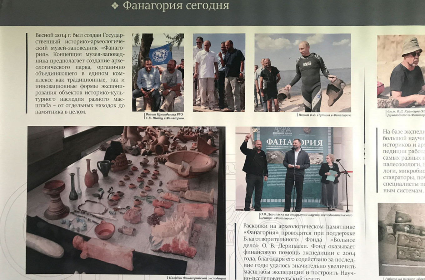 Из десятка крупных полисов, основанных эллинами на северном побережье Черного моря, больше других повезло Фанагории. Остатки древнегреческого поселения на территории нынешнего поселка Сенной в Темрюкском районе оказались по соседству с малой родиной миллиардера Олега Дерипаски. С 2004 г. благотворительный фонд бизнесмена «Вольное дело» пожертвовал на раскопки Фанагории 717 млн руб. или $16,4 млн. Фанагория превратилась в крупнейший в стране центр археологических раскопок и один из немногих в Европе, где ведутся  систематические подводные исследования (1/3 площади античного города, основанного более 2500 лет назад, со временем оказались под водой).