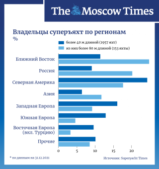 Из заказов на общую сумму 35-40 млрд евро заказы от российских покупателей сейчас составляют 3,9 млрд евро, по подсчетам аналитической фирмы Boat International. Она сообщает, что больше всего суперъяхт для российских клиентов строят итальянские верфи, где сейчас ведутся работы по производству 60 судов; за ними идут верфи Нидерландов и Турции.