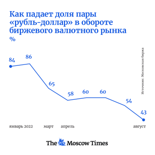 Это происходит на фоне значительного сокращения доли торгов парой «рубль-доллар» — она впервые опустилась ниже 50%. Пара «рубль-юань» стремительно догоняет «рубль-евро»: уже 19% (в январе был 0) против 23%.