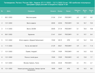 В конце апреля «Вечер с Владимиром Соловьевым», где участники прочили быстрый крах «нацистам», занимал 4-е место в рейтинге, уступая лишь новостным программам. «60 минут» Скабеевой, где зрителям рассказывали о подлетном времени ракет до европейских столиц, держались на 10-й строчке, а первые дни войны поднимались в общероссийский топ-5.