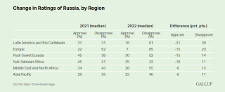Но рядовые граждане в мире, судя по данным Gallup, восприняли войну однозначно. Если в 2007 г. 35% опрошенных говорили, что у них недостаточно информации, чтобы дать оценку российскому руководству, то в 2022 г. таких оказалось всего 18% – минимум за время проведения опросов. А рост неодобрения минимум на 10 процентных пунктов был зафиксирован в 84 странах.