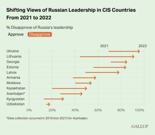 Изменение настроений в странах бывшего СССР в целом соответствует раскладу сил в мире. Развязав войну, Россия замарала свой образ в глазах представителей всех регионов за исключением стран Африки южнее Сахары (но и там он померк). Впервые за 15 лет опросов об отношении к мировым лидерам большинство жителей Земли осудило Путина и его режим, сообщал Gallup в конце апреля.