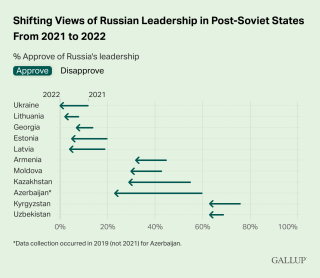 «В странах, которые в целом в последние десятилетия скептически относились к российскому руководству – Украине, Грузии и странах Балтии, разрыв между одобряющими и не одобряющими превратился в бездну, – пишет Gallup в отчете «Закат империи? Россия теряет поддержку собственных соседей». – А в четырех странах, где к руководству России исторически относились с симпатией – Армении, Молдове, Казахстане и Азербайджане, доля не одобряющих теперь превышает долю одобряющих. Например, в Армении уровень одобрения упал на 13 процентных пунктов (с 45% до 32%), а неодобрения – вырос на 20 п. п. (с 38% до 58%)».