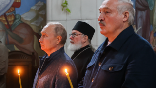 Затем Путин и Лукашенко побывали на на службе в храме Смоленской иконы Божией матери, где, как сообщил канал «Россия-1», приняли участие в молитве «о даровании победы русскому воинству».