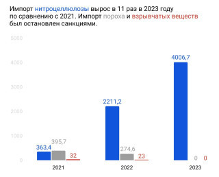 В апреле 2022 года в рамках очередного пакета санкций ЕС запретил поставки нитроцеллюлозы в РФ, что не помешало Москве успешно их нарастить. В 2022 году импортеры ввезли более 2 тысяч тонн нитроцеллюлозы, что в 5,5 раз больше, чем до войны. В 2023 году закупки удвоились до 4 тысяч тонн. Таким образом, импорт нитроцеллюлозы в 2023 году по сравнению с довоенным 2021 годом вырос в 11 раз.