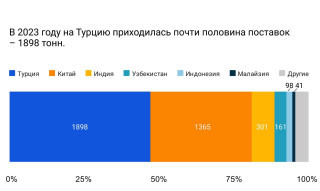 Из Турции российские компании в 2023 году привезли более 1,8 тыс.тонн нитроцеллюлозы. В таможенных декларациях, на основе которых формируется проанализированная база внешнеэкономической деятельности, было указано, что 27% поставленной нитроцеллюлозы были произведены в Таиланде и 6% в Германии. Остальная нитроцеллюлоза якобы была произведена в самой Турции. По данным статистического сервиса ООН Сomtradе, Турция активно завозит нитроцеллюлозу из стран Азии и Евросоюза. В частности, в 2022 году почти 70% нитроцеллюлозы Турция ввезла из стран ЕС (Германия, Чехия, Италия, Испания). Сравнение товарных потоков нитроцелюлозы свидетельствует о том, что Турция импортирует значительно больше нитроцеллюлозы, чем экспортирует, поэтому вероятно, весь турецкий экспорт нитроцеллюлозы — это перепродажа продукции из ЕС и Азии.