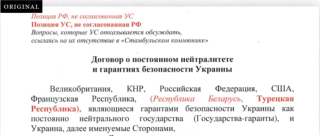 Foreign Affairs сравнил варианты от 12 и 15 апреля и выяснил, что по ряду ключевых вопросов стороны не нашли согласия. Если в «Стамбульском коммюнике» и версии от 12 апреля говорилось, что в случае вооруженного нападения на Украину государства-гаранты самостоятельно решают вопрос об оказании ей военной помощи, то в версии от 15 апреля появилось российское требование о том, чтобы это делалось «на основе согласованного [ими] решения». Такой вариант не устроил Киев, потому что, снова напав на Украину, Россия могла бы заблокировать помощь ей.