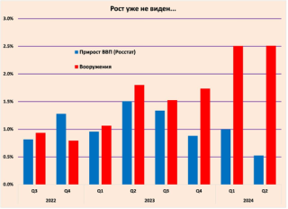 «Хорошо видно, что за исключением четвёртого квартала 2022 г. — на этот период пришёлся восстановительный рост невоенной экономики — рост ВВП за счёт производства вооружений превышал объявленный Росстатом рост экономики, т. е. гражданский сектор российской экономики медленно скукоживается».