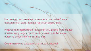 Последние года три мы все живем будто в галлюцинациях: ну не может быть того, что происходит в реальности! Но психозы, признаком которых являются галлюцинации, в военное время возникают реже, чем в мирное. Это если у людей. А у государств? – об этом в новом выпуске нашего психологического сериала.