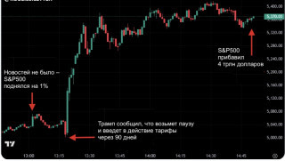 Пока политологи ловили каждое слово политиков из Белого дома, Брюсселя и Пекина, экономисты считали, какие последствия будут иметь пошлины, введенные Трампом для товаров со всего мира, а инвесторы смотрели на графики движения фондовых активов и тихо, скажем так, изумлялись. Особое же изумление у них вызвал график индекса S& P (отлеживает 500 крупнейших компаний США) за 9 апреля — день, когда Трамп объявил о приостановке действия тарифов на 90 дней для всех, кроме Китая. Разобрали по минутам: 13:02 по восточному времени индекс S& P 500 вырос почти на +1% за 4 минуты без каких-либо важных новостей. К 13:10 по восточному времени рост на +1% был практически растерян. Затем, ровно через 8 минут, в 13:18 по восточному времени, президент Трамп объявил о 90-дневной тарифной паузе – и рынок отправился в космос.