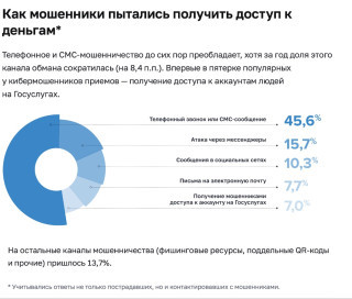 Вот статистика от сервильной компании Kaspersky: в I квартале 2025 года мошенники в 43% случаев использовали сотовую связь, а не мессенджеры. Почти та же доля – в отчете Центробанка РФ: в 45% случаев мошенники получали доступ к чувствительным данным с помощью сотовой связи или СМС и только в 16% — через мессенджеры.