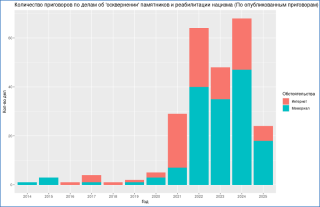 Из 128 опубликованных приговоров, вынесенных за 2014–2025 года, в 92 делах подсудимый обвинялся в публикациях в интернете. Непосредственно за отрицание Холокоста или восхваление нацистской Германии судили только в 41 случае. В 18 делах обвиняемые загружали на сайты акций Бессмертный полк фотографии Гитлера либо немецких офицеров.