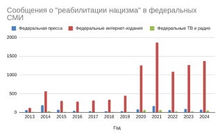 В федеральных СМИ резкий подъем обсуждения «реабилитации нацизма» приходится на 2020 год, что, по всей видимости, отражает повышенное внимание со стороны властей, которые регулируют медиа-повестку.
