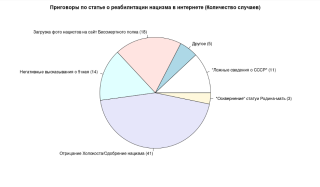 Далее отбирались материалы только тех дел, по которым опубликован приговор. По статье о «реабилитации нацизма» (354.1 УК РФ) отбирались как дела, возбужденные за публикации в интернете, так и дела об осквернении памятников, связанных с Великой отечественной.