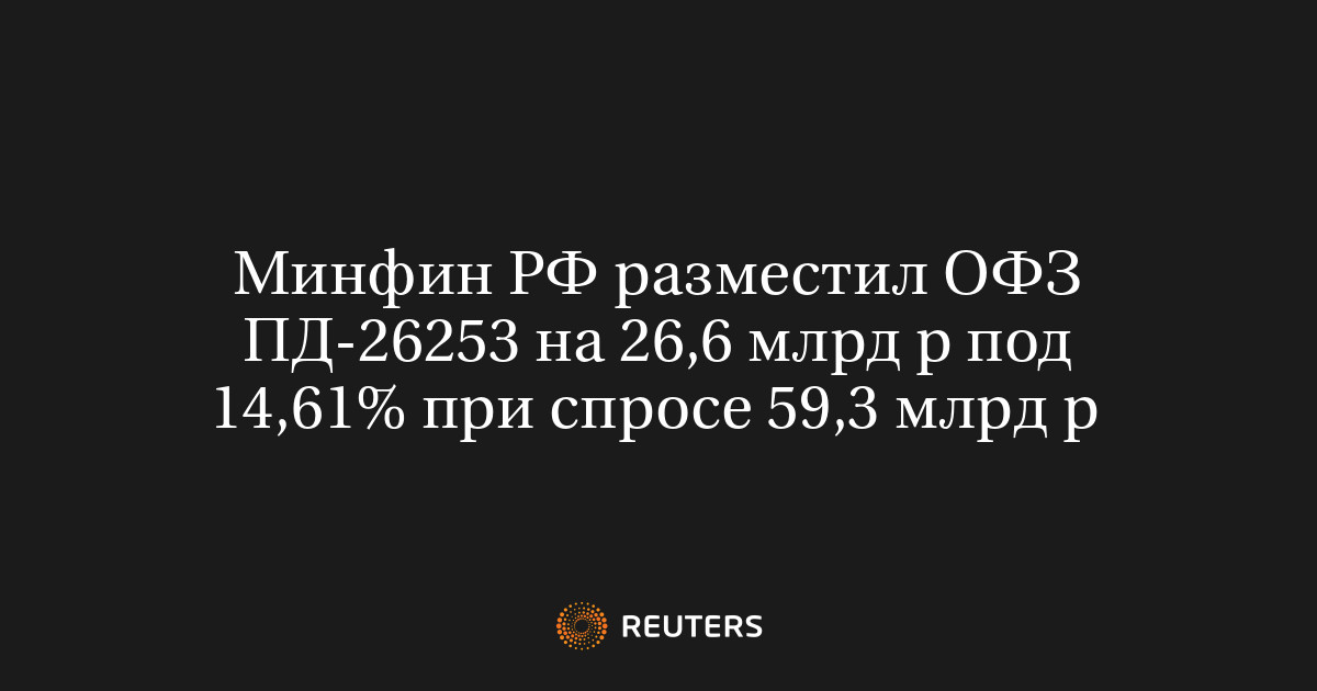 Минфин РФ разместил ОФЗ ПД-26253 на 26,6 млрд р под 14,61% при спросе 59,3 млрд р