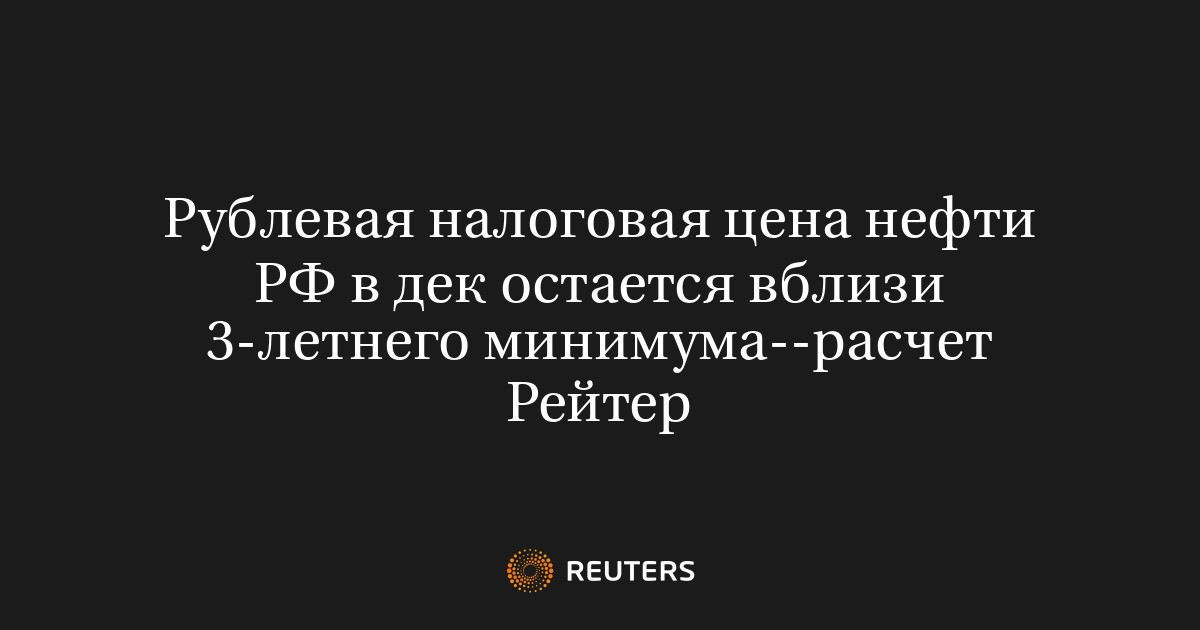 Рублевая налоговая цена нефти РФ в дек остается вблизи 3-летнего минимума--расчет Рейтер