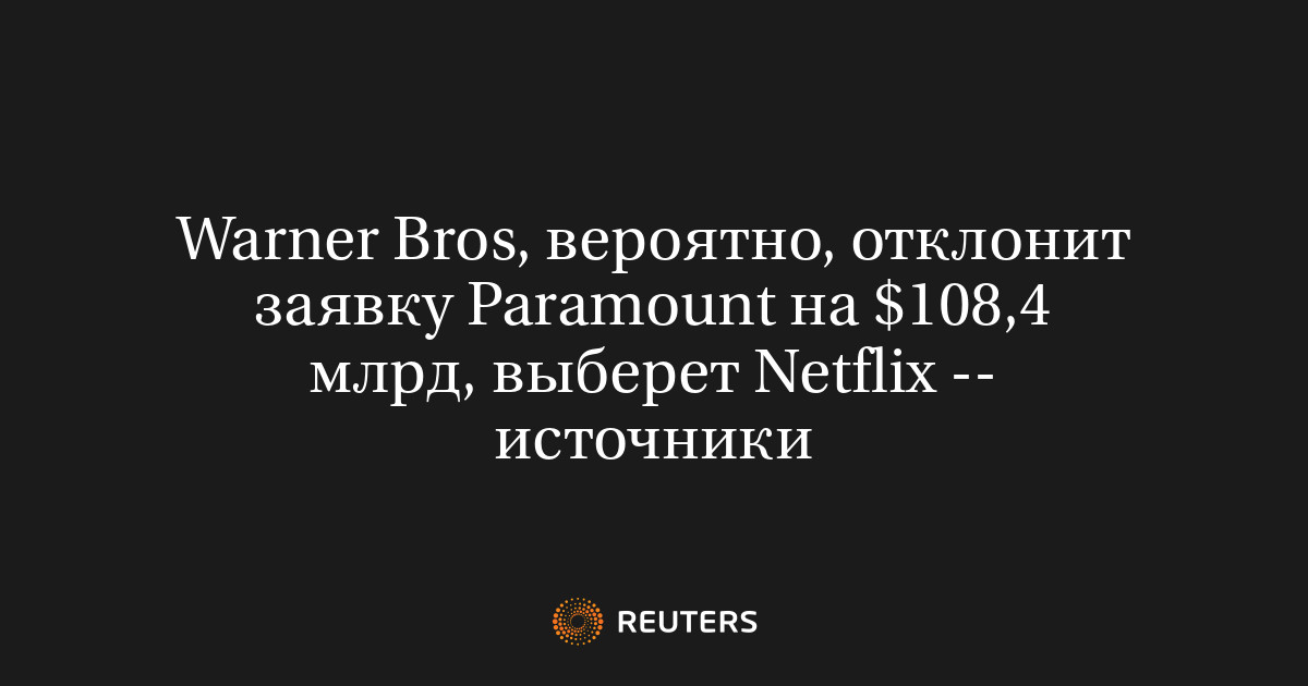 Warner Bros, вероятно, отклонит заявку Paramount на $108,4 млрд, выберет Netflix -- источники