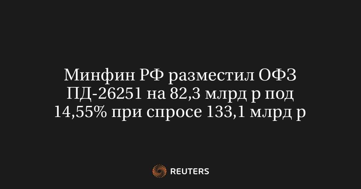Минфин РФ разместил ОФЗ ПД-26251 на 82,3 млрд р под 14,55% при спросе 133,1 млрд р